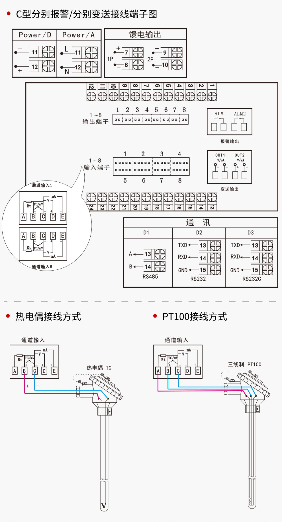 答:統一報警是在多通道輸入的情況下共用一組報警輸出,如:8路信號輸入,現在顯示儀表巡檢顯示到第一通道, 如果這時達到第一通道的報警值就輸出報警;然后儀表巡檢到第二通道,報警取消,如第二通道也達到第二路的報警設定值,則也報警輸出。記憶報警功能只在統一報警時有此功能,如這時設定了記憶報警,巡檢到第二路時不管第二路有沒到設定報警值,儀表都會保持住第一通道的報警。比如,第一路是上限報警,到第二路時第二路為下限報警,儀表就會顯示上下限同時報警,報警只有等儀表巡檢一圈回到第一通道時,第一通道顯示值也沒有到達報警范圍時,這個上限報警才會取消,這時顯示儀表還保存住第二路的下限報警,也要等到巡檢到第二通道并且顯示值在正常范圍時才會取消報警。分別報警就是多通道儀表每通道都會有一組對應的上下限報警輸出,互相不干擾,報警隨時根據輸入的信號值變化,不用等儀表巡檢到各個通道。