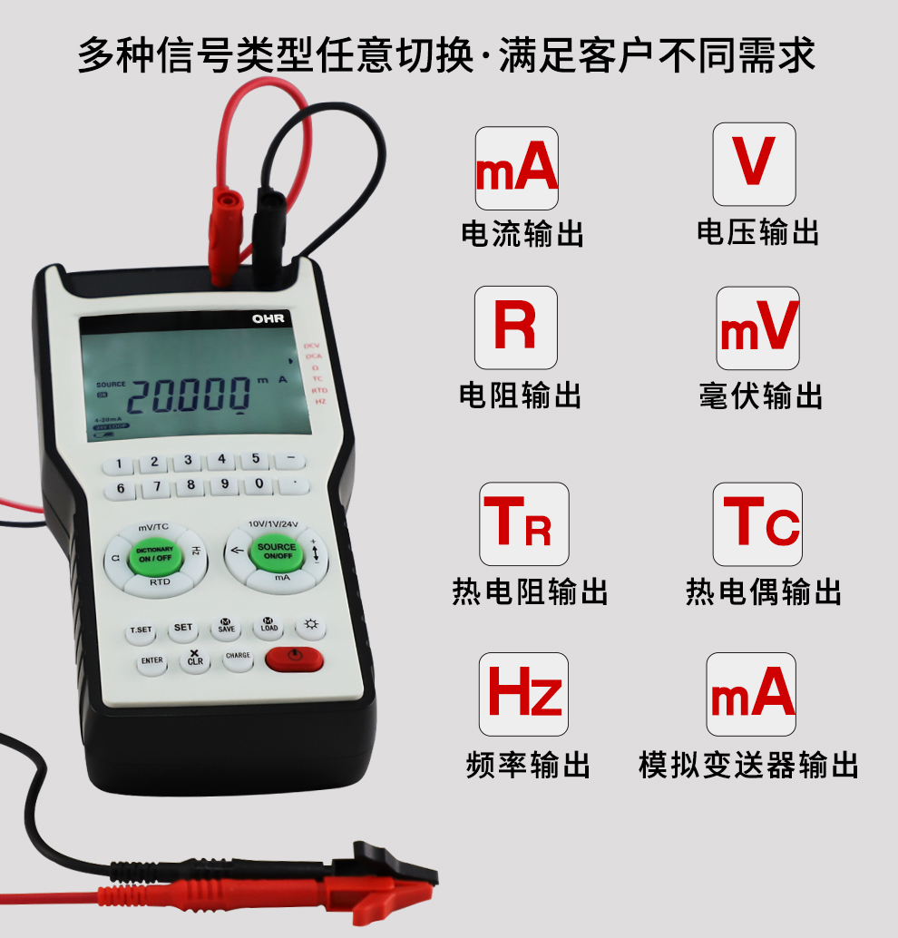 信號(hào)發(fā)生器是一種多功能、高精度便攜式信號(hào)源,可用于輸出各種規(guī)格的工業(yè)信號(hào),支持電流、電壓、電阻、頻率、熱電偶、熱電阻等多種信號(hào)輸出類型,最高精度可達(dá)0.01%F.S,是工業(yè)現(xiàn)場(chǎng)、實(shí)驗(yàn)室以及各類儀表制造商必備的計(jì)量測(cè)試工具。